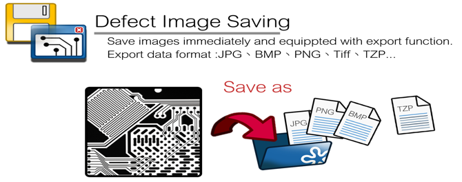 Output data supported (JPG、BMP、PNG、TIFF、TZP) format. All defect images will be saved.