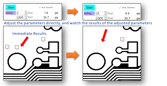 When parameter or image changed, system will update new defect detected results and display. What you see is what you inspect.