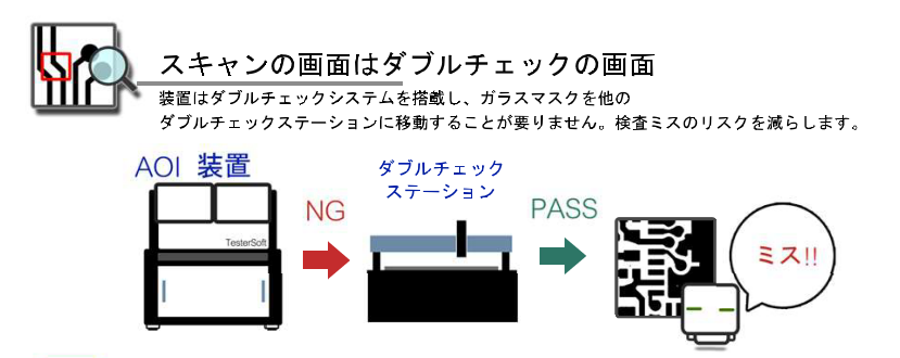 検査機には再検査システムがありますので、検査対象を再検査ステーションに移動しなくてもいいです。再確認画面がスキャン画面となっておりますので、検査ミスのリスクを減らすことができます。