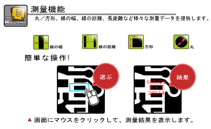 線幅や、線距離や、円形/正方形PADや、中心からの距離や、長距離などの測量機能が搭載されており、再検査を順調にできます。