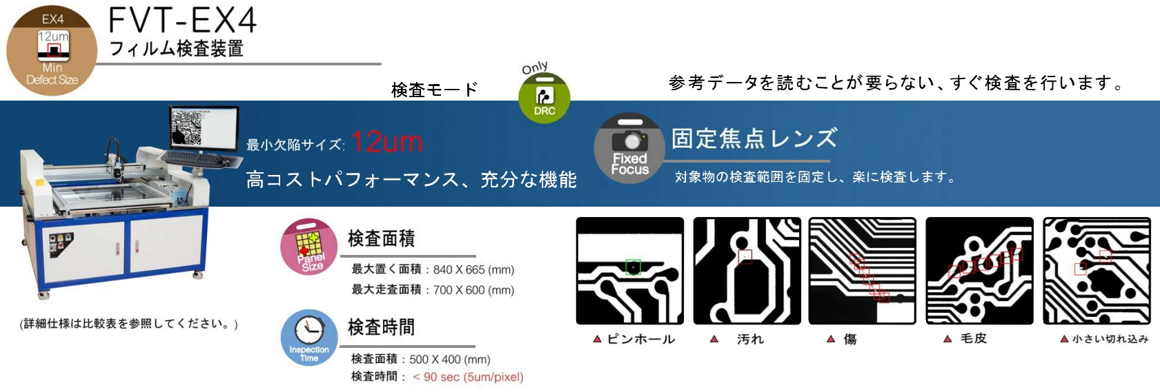 機能豊富、高コスパ。前作業不要、即時に検査執行可能。フィルム検査では、検出可能な最小欠陥は12umで、最小線幅/距離は40um。